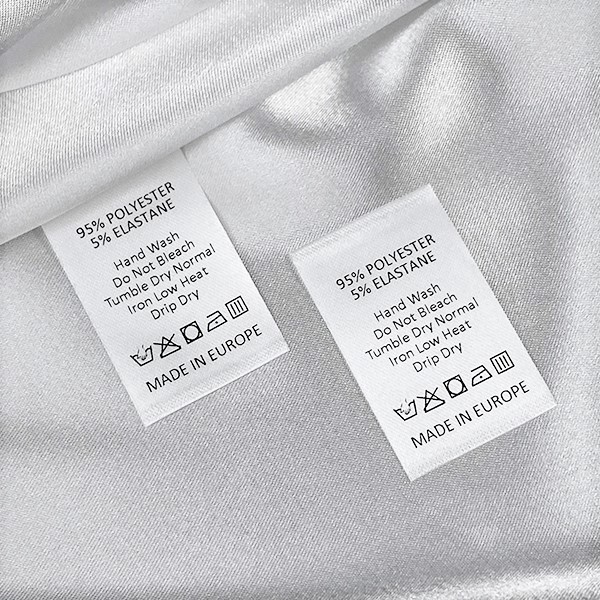 Етикет за пране и грижа със символи за поддръжка и пране, персонализиран с името на марката и състава, отпечатан върху фин бял сатен. Този тип текстилен етикет е направен с помощта на най-нови технологии в дигиталната сфера на текстилни изделия. Етикетите са отпечатани върху специален сатен чрез термично залепване като имат и високо качество на дизайна и висока устойчивост към изпиране.