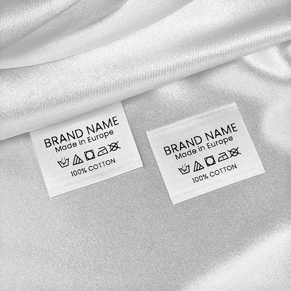 Текстилен етикет за дрехи и аксесоари, направен от бял сатен, включващ символи за пране и грижа, и състав. Този тип текстилен етикет е направен с помощта на най-нови технологии в дигиталната сфера на текстилни изделия. Етикетите са отпечатани върху специален сатен чрез термично залепване като имат и високо качество на дизайна и висока устойчивост към изпиране.