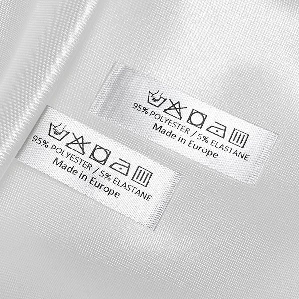Текстилен етикет със символи за пране и грижа, персонализиран с детайли за състав и държава на производство, за пришиване към дрехи. Този тип текстилен етикет е направен с помощта на най-нови технологии в дигиталната сфера на текстилни изделия. Етикетите са отпечатани върху специален сатен чрез термично залепване като имат и високо качество на дизайна и висока устойчивост към изпиране.