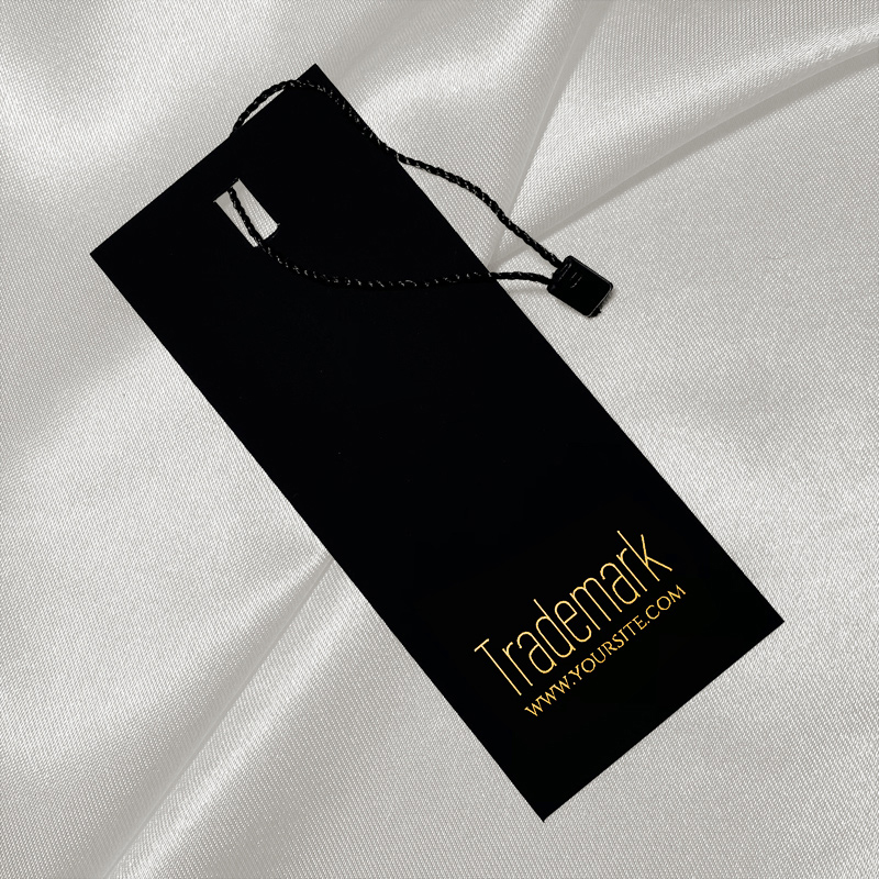 Картонен етикет за дрехи, включващ обвивка и шнур от полиестер за закачане, модел HT-M108, направен от плътен черен картон, персонализиран със златен надпис или лого. Този вид висящ етикет е направен от висококачествени материали чрез най-нови технологи в сферата на дигиталното печатане.