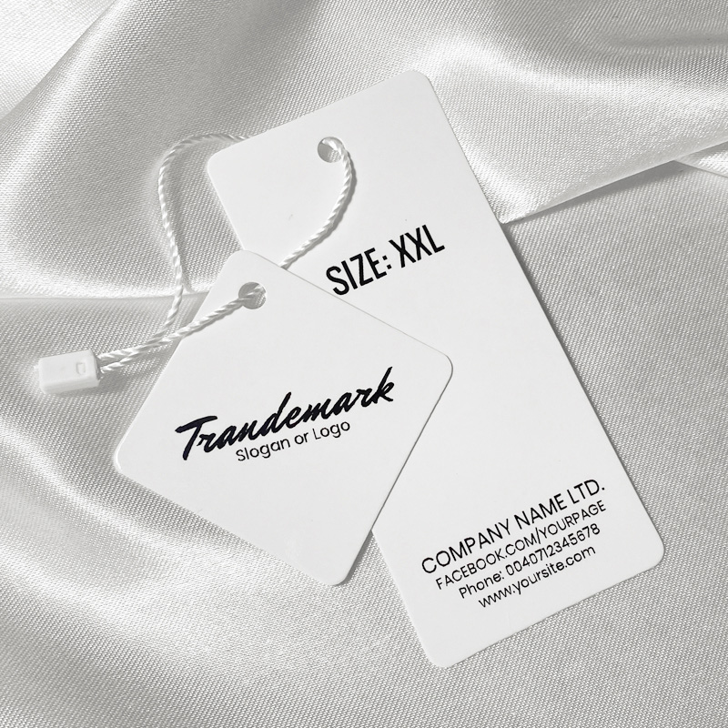 Картонен етикет за дрехи с бяла обвивка, направен от плътен ламиниран картон с лъскаво фолио и персонализиран с надпис или лого. Този вид висящ етикет е направен от висококачествени материали чрез най-нови технологи в сферата на дигиталното печатане.