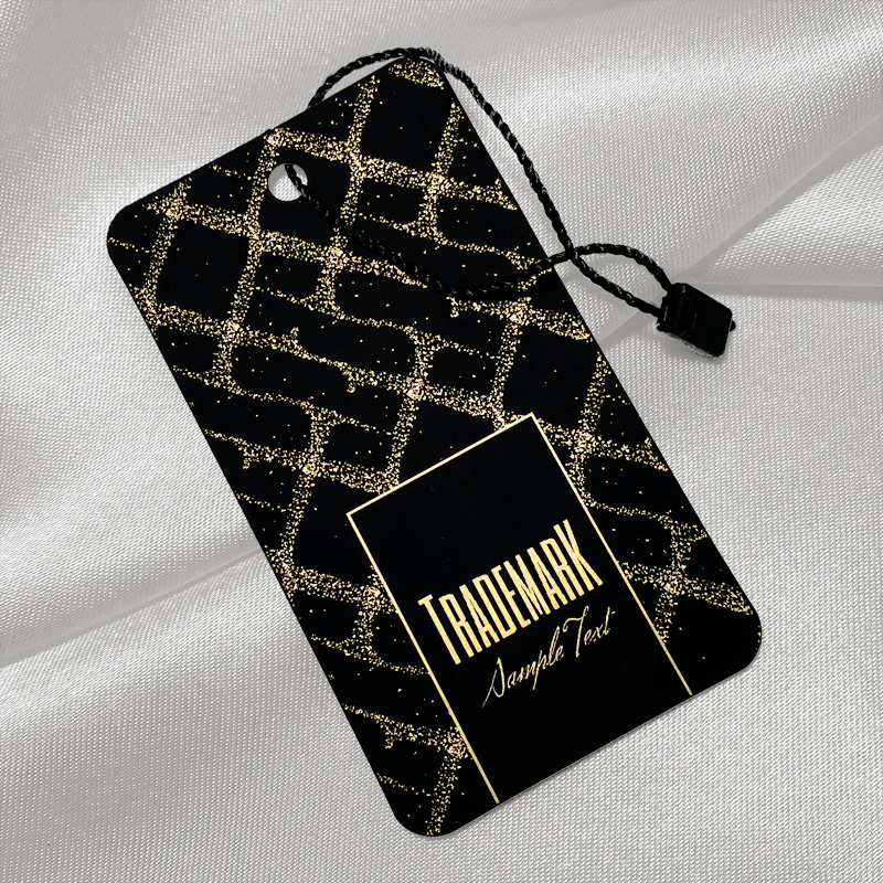 Етикет със златен надпис, направен от ламиниран картон със специално велурено текстуриращо фолио, подходящ за дрехи, аксесоари, обувки и други. Този вид висящ етикет е направен от висококачествени материали чрез най-нови технологи в сферата на дигиталното печатане.
