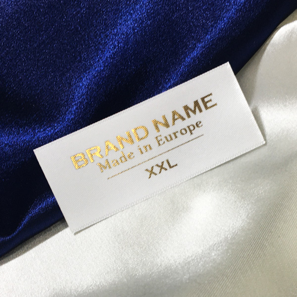 Текстилен етикет, отпечатан с персонализиран текст и размер върху сатенен плат, отрязан според представените размери.